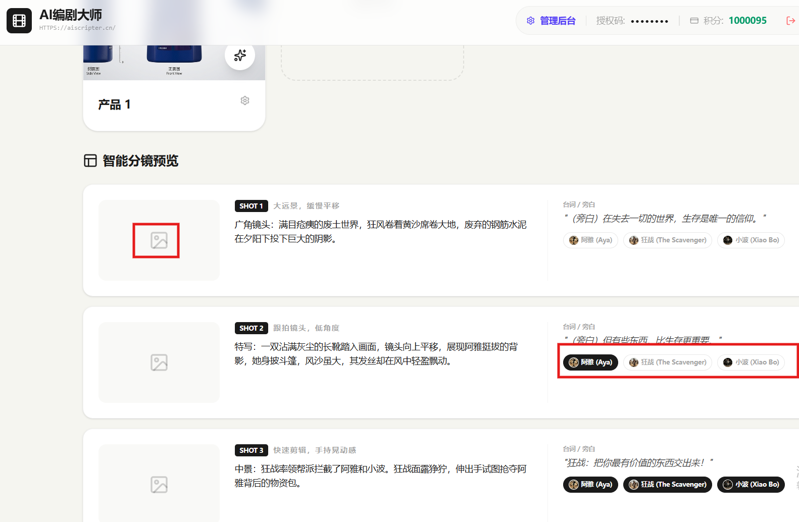 分镜图预览,这里可以看到每个分镜中出现的角色已经默认选中,这里当所有角色和产品都生成图片后,
