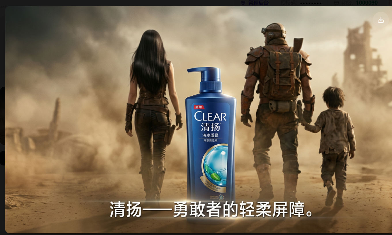 最近在追美剧  《辐射》/Fallout , 就以废土世界主题生成一个宣传洗发水产品的剧本