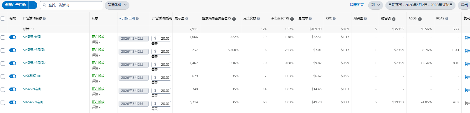 SP自动,本来是不想开自动广告,上周看广告整体数据不太好,结合本品关键词流量少,还是把它开启来跑一段时间;