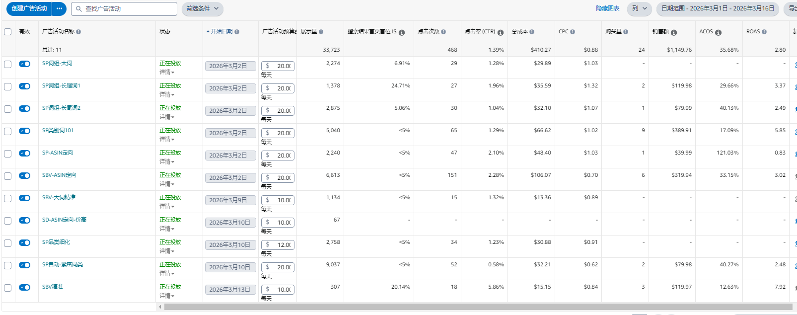 3. 第二周,从3月9日开始,陆续新增5个广告活动
