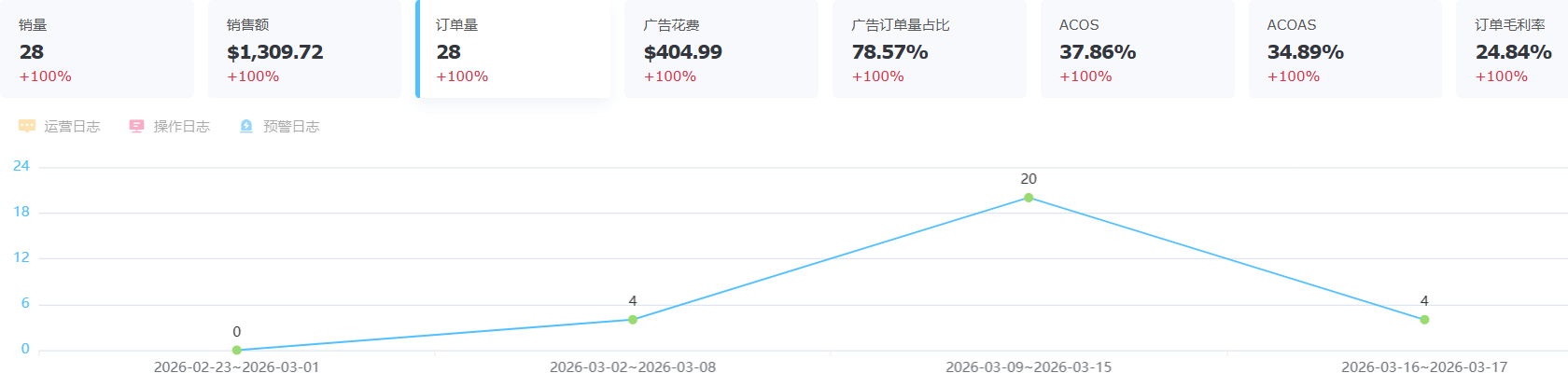 产品在3月初上架,本周是第三周,目前总销量28单,78%是广告单,ACOS 37%, 毛利率24%,整体数据上符合预期。