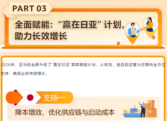 2026年4月1日起,亚马逊日本站将降低关键尺寸段的亚马逊物流(FBA)费用。对于标准尺寸(20-80厘米、重量不超过5公斤)的商品,亚马逊将减少配送费用,进一步降低您的履约成本。