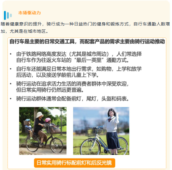 在健康意识与环保理念的双重推动下,骑行已超越通勤本身,成为都市人日常健身与生活态度的表达。约30%的日本人定期骑自行车健身,超过40%的日本骑行者表示对个性化装备感兴趣。这使得装备需求从“有就行”升级为“必须专业、安全且时尚”。 预计到2035年,日本自行车服装及配件市场规模将达到9.1217亿美元。