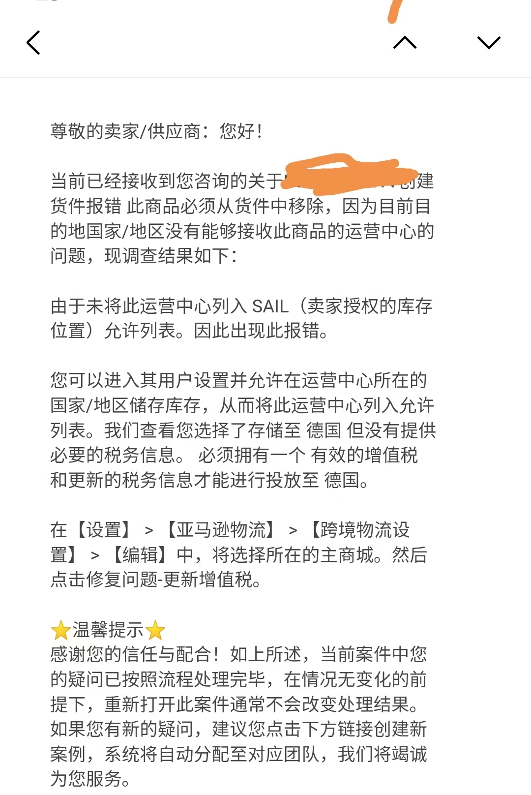 新店注册德国VAT时税代要FBA库存证明(也就是要在亚逊后台创建一个货件),但是我无法成功创建FBA货件(我以在德国启用库存仓储也在平台上传了德国包装法和欧代了),我邮件问亚马逊,亚马逊回复我说是没有在亚马逊上传德国VAT号就无法创建FBA货件。但是这两个自相矛盾啊!我应要怎么做?
