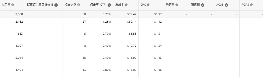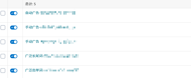 我的广告结构是打一个自动广告(同类\紧密)、两个手动广泛(长尾词*5个,并否定了精准词组里面的词)两个手动精准(5个精准长尾词)。