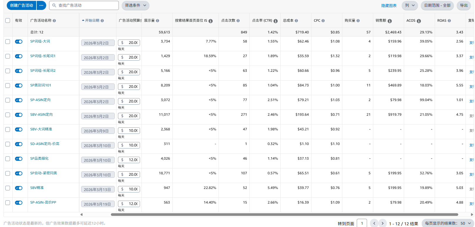 1. 共开了12个广告活动,广告单57个,自然单7个,ACOS 29.13%,