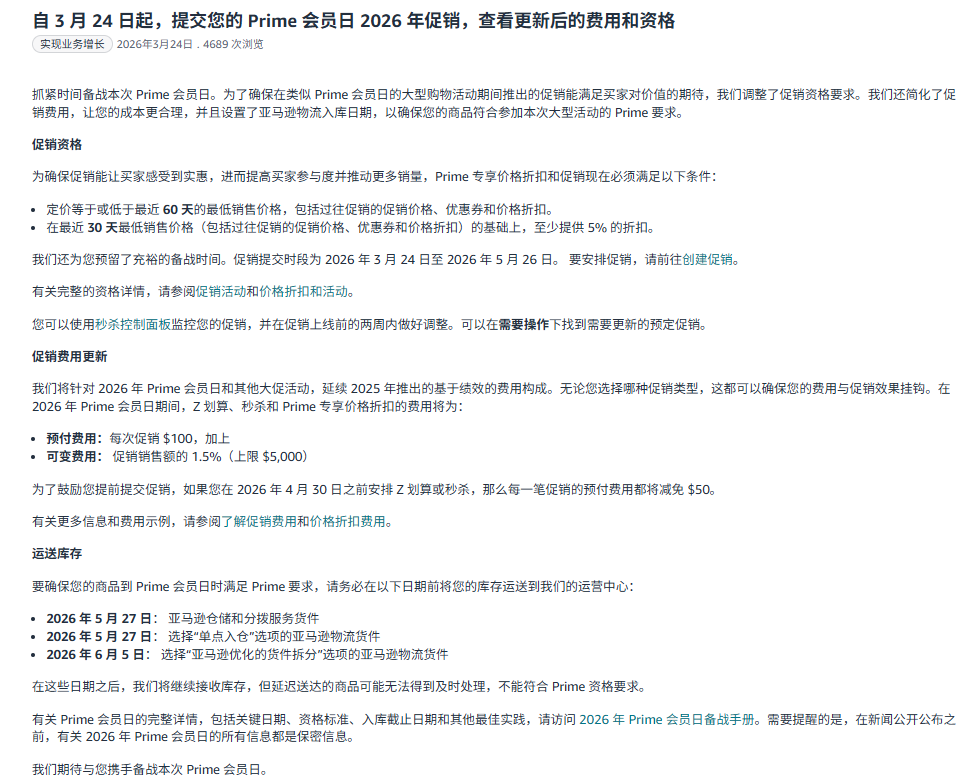 有关 Prime 会员日的完整详情,包括关键日期、资格标准、入库截止日期和其他最佳实践,请访问 2026 年 Prime 会员日备战手册。需要提醒的是,在新闻公开公布之前,有关 2026 年 Prime 会员日的所有信息都是保密信息。