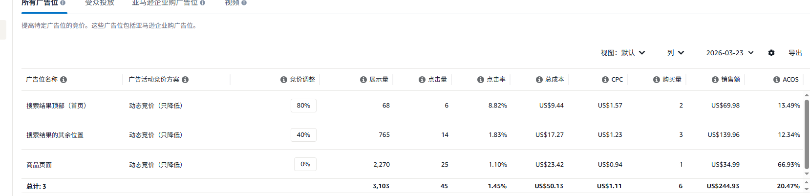 这个时候我想控制商品页面的曝光,通过控制实际出价。根据公式:实际出价 = 基础竞价 ×(广告位 1+%)×(分时竞价 1+%),要么调整基础竞价,要么改变分时竞价比例。