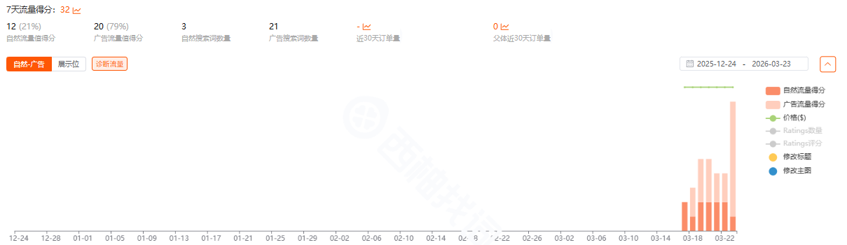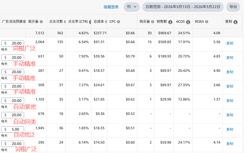 我现在打的就是A+B的长尾词和A+B的词根广泛,这些词的流量都很小,所以整体曝光偏低,但点击率和转化率都还不错。目前的问题是——要增长,必须拓展流量池。