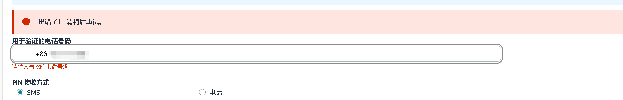 但是无论选择短信和电话,都出现如下报错。