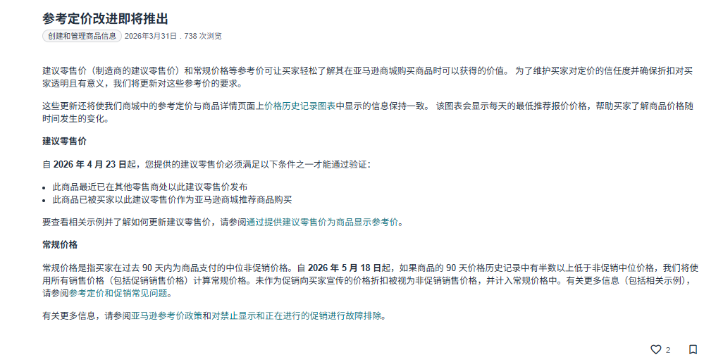 亚马逊官方今日发布 参考定价改进即将推出!!! 不能再虚高定价再打折