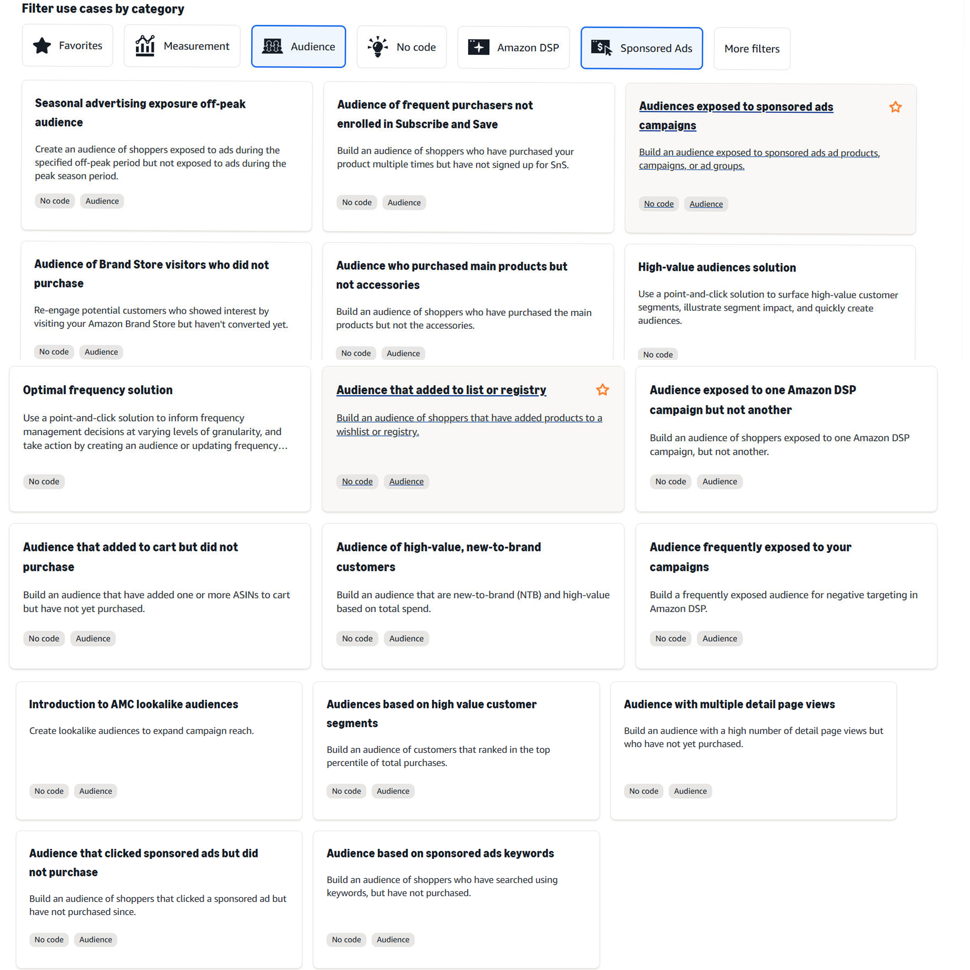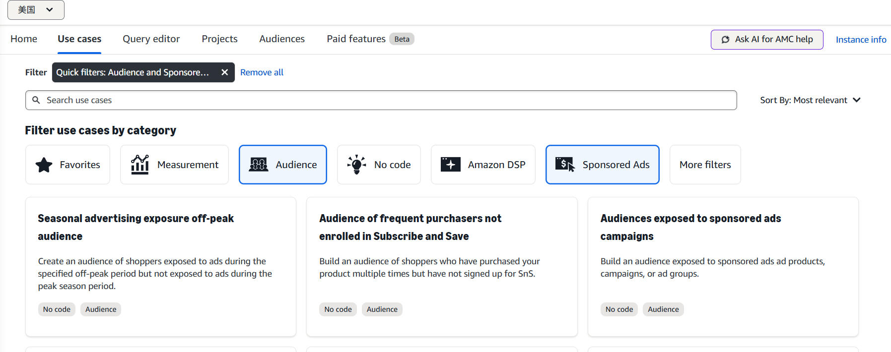 步骤二:我们选use case,筛选两个目标,一个是Audience人群受众,一个Sponsored Ads,这样就可以分析SP广告创建对应的受众了