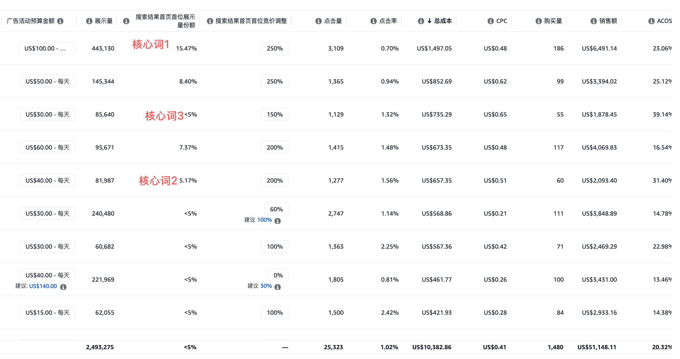 3,以及目前的几个核心词中搜索结果首页收尾展示量的份额具体对应的含义一直没有太弄明白,例如核心词1的占比为15.47%,我是否应该继续提高竞价,让该份额的展示量更高呢?