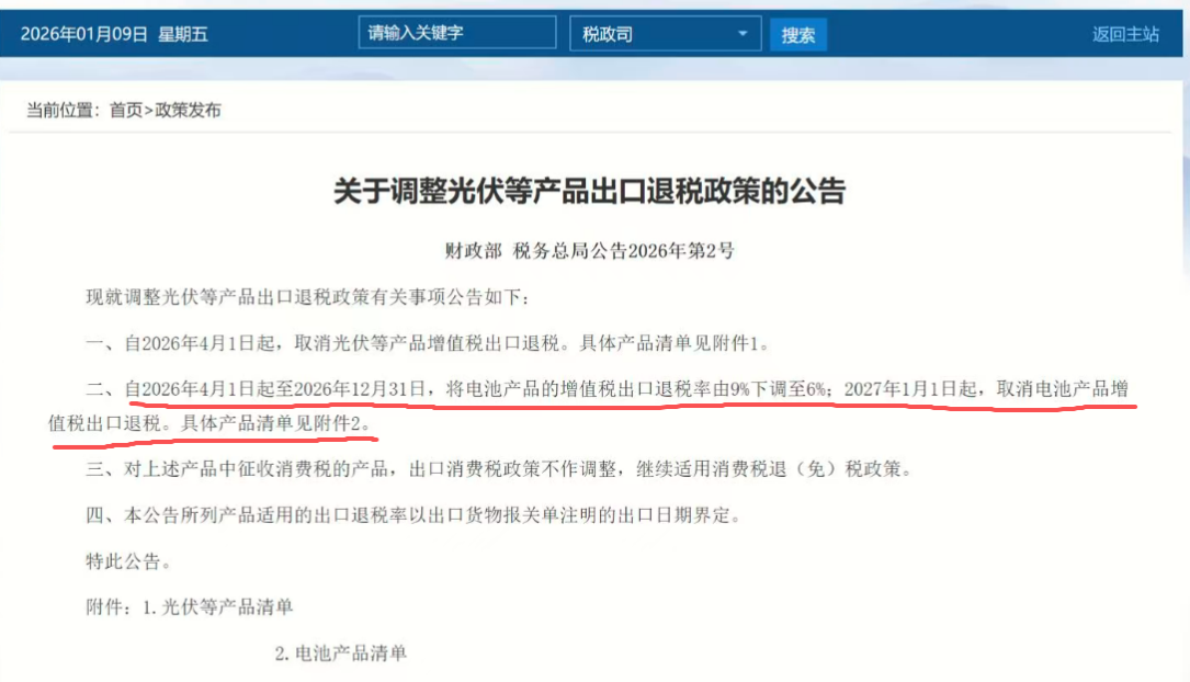 根据财政部、税务总局2026年1月发布的《关于调整光伏等产品出口退税政策的公告》(2026年第2号),电池产品的出口退税政策调整分两步走: