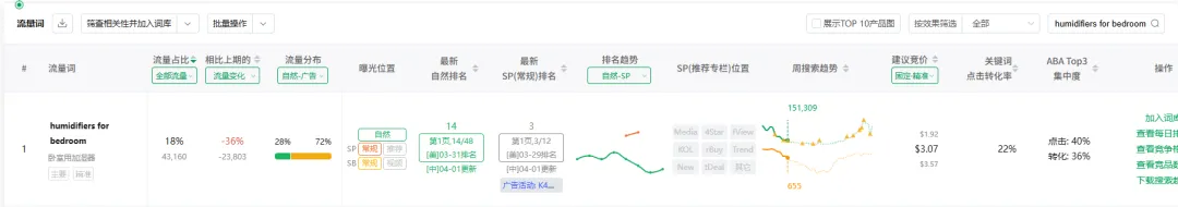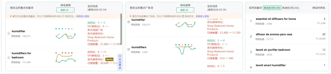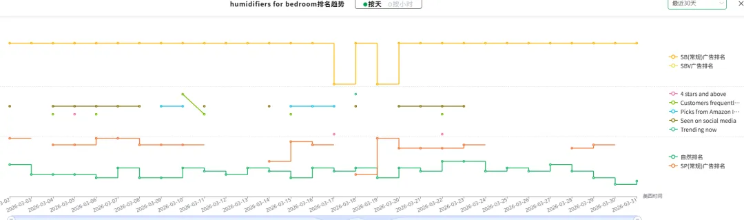 切换到TOP关键词,就可以发现,humidifiers for bedroom广告位丢失,自然位也从第8位下降到11位。这一步做完,基本就能确定:是哪个关键词、哪一天、哪种流量开始崩的。