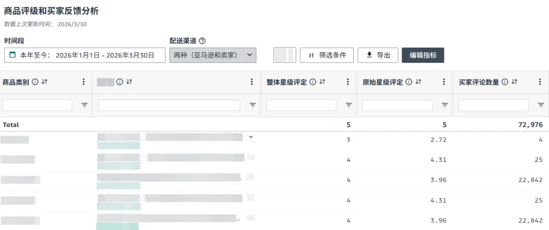 在页面左侧找到:整体业务绩效,找到商品评级和买家反馈分析版面。如果没有“原始星级评定”,可以点击黑色的“编辑指标”按钮进行添加。