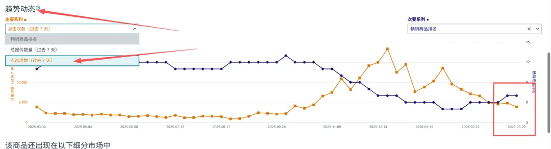 进入商机探测器,输入自己的ASIN,点击ASIN后,在“趋势动态”板块选择“点次数(过去7天)”,就能看到每周点击次数的对比。