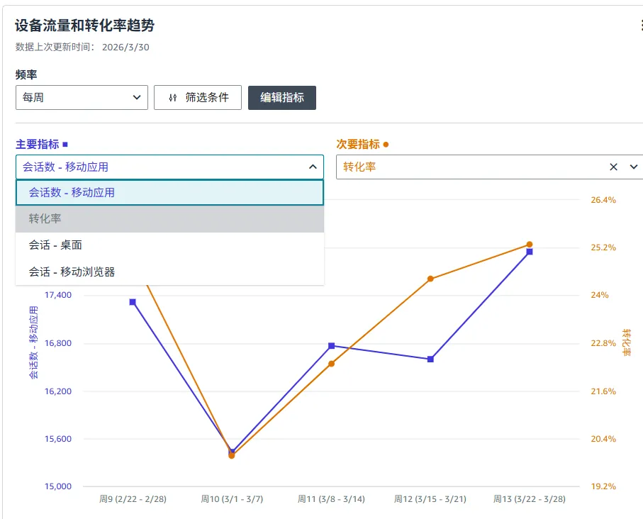 另外,我们可以考虑将设备流量与转化率加入分析项中。如图所示,我们可以查看移动端和PC端会话与转化率的趋势,来判断是哪一部分转化率下降了:是手机用户不买,还是电脑用户不买,再针对性优化图片/排版。