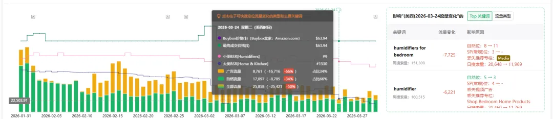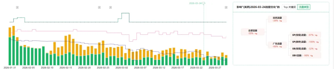 如图所示,在反查流量词的搜索框中输入ASIN后,可以发现流量柱状图最短的是3/24号。这里可以看到广告流量(黄色)、自然流量(绿色)相对前面几天而言都是最低的。当我们点击3/24的柱子后,会发现在右侧出现关于3/24号的流量类型分析。我们可以明确看到,在这一天广告和自然流量双双下跌:广告下跌最为严重(-66%),自然流量下降(-34%)。