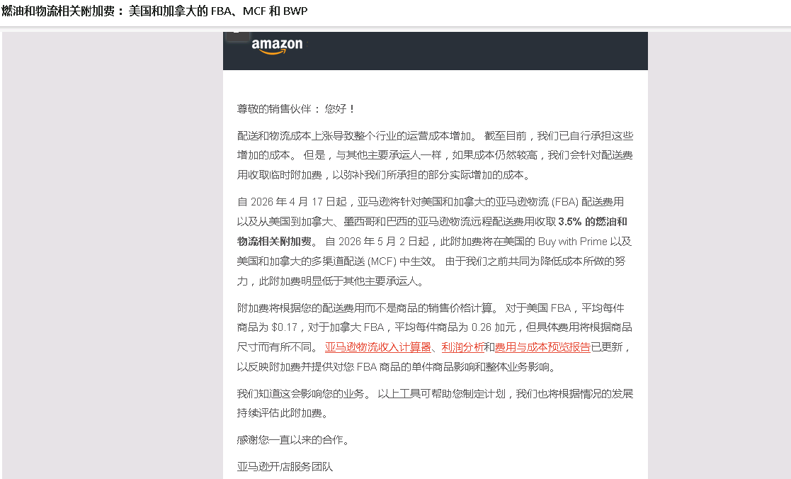 自 2026 年 4 月 17 日起,亚马逊将针对美国和加拿大的亚马逊物流 (FBA) 配送费用以及从美国到加拿大、墨西哥和巴西的亚马逊物流远程配送费用收取 3.5% 的燃油和物流相关附加费。 自 2026 年 5 月 2 日起,此附加费将在美国的 Buy with Prime 以及美国和加拿大的多渠道配送 (MCF) 中生效。 由于我们之前共同为降低成本所做的努力,此附加费明显低于其他主要承运人。
