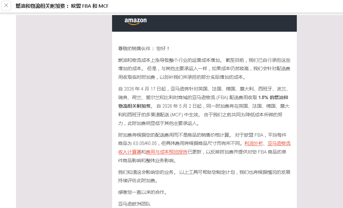 自 2026 年 4 月 17 日起,亚马逊将针对英国、法国、德国、意大利、西班牙、波兰、瑞典、荷兰、爱尔兰和比利时商城的亚马逊物流 (FBA) 配送费用收取 1.5% 的燃油和物流相关附加费。 自 2026 年 5 月 2 日起,同一附加费将在英国、法国、德国、意大利和西班牙的多渠道配送 (MCF) 中生效。 由于我们之前共同为降低成本所做的努力,此附加费明显低于其他主要承运人。