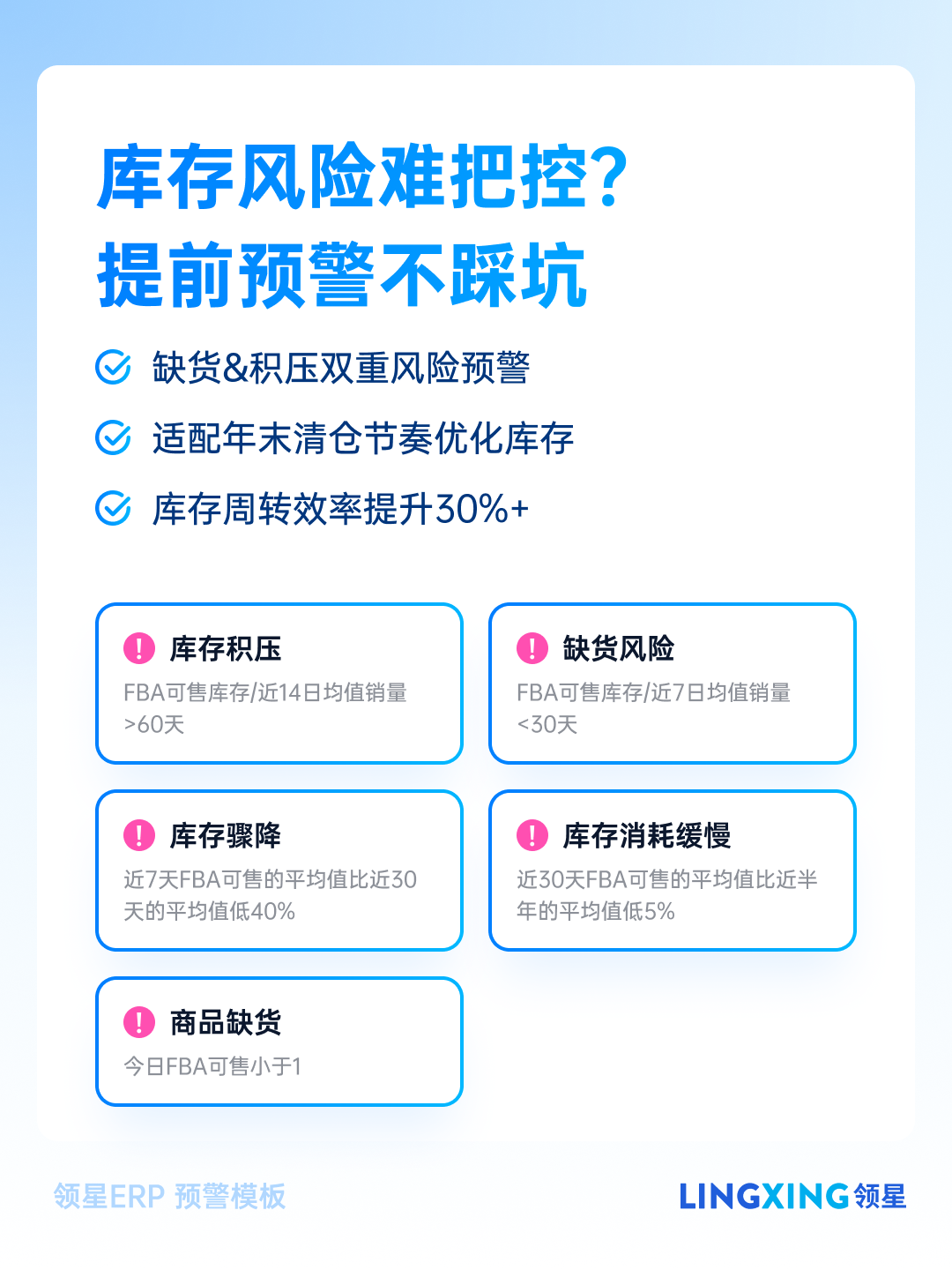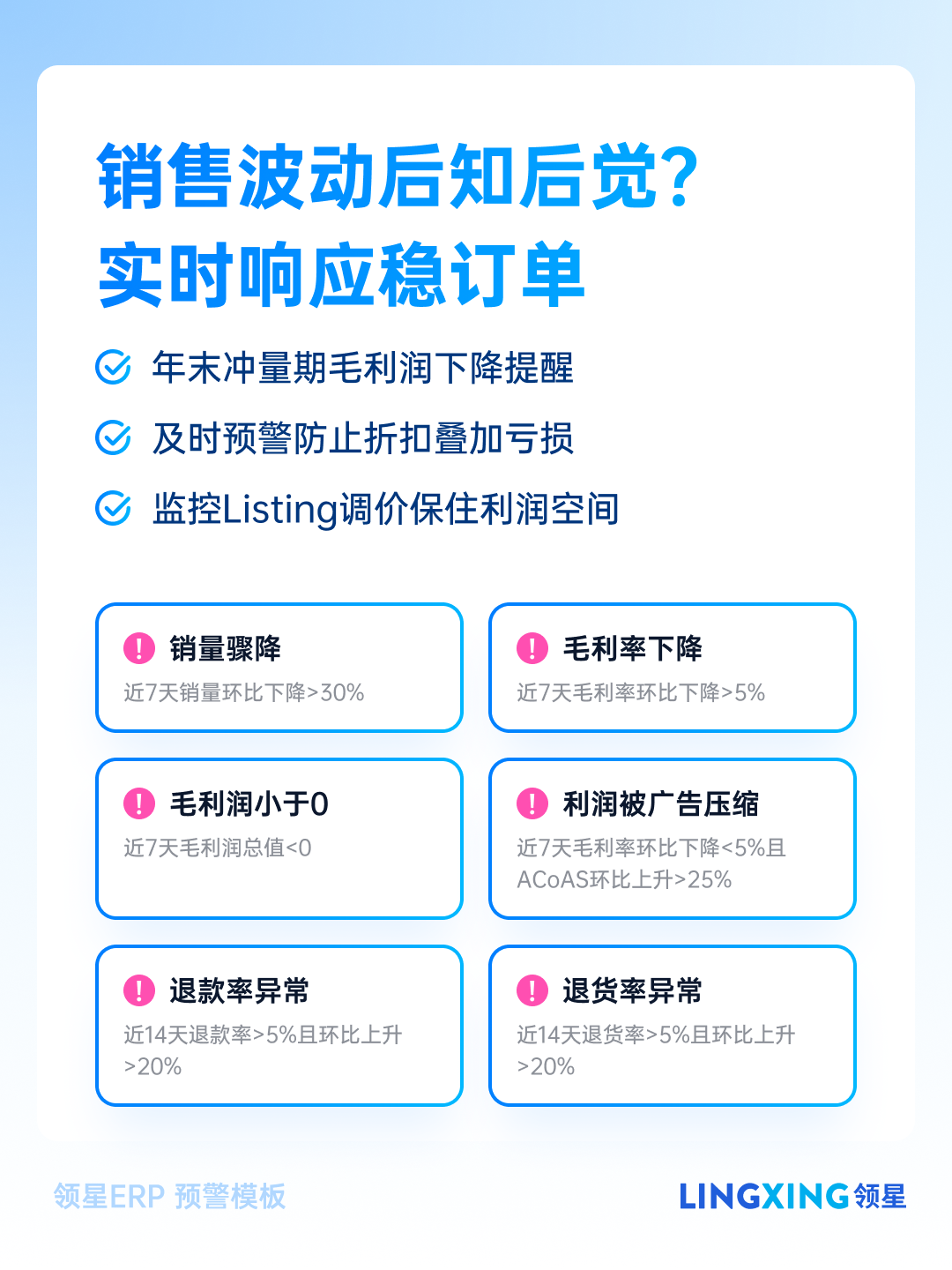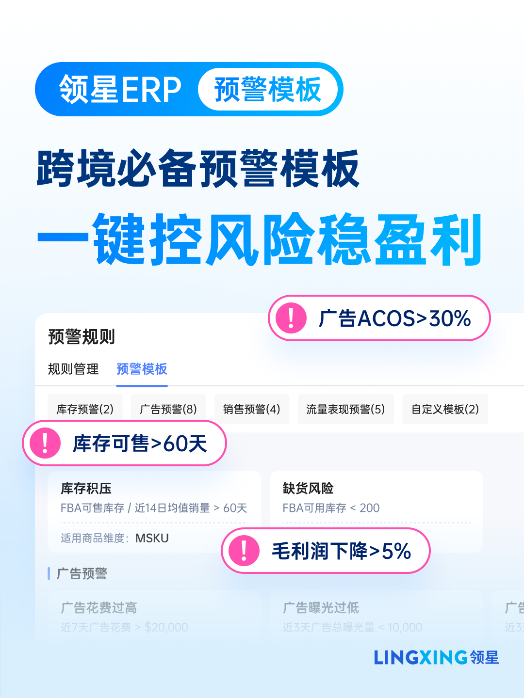 而领星 ERP 的【预警模板】功能,正是解决这些痛点的落地路径。告别繁琐的自定义设置,一键搞定所有核心数据监控,让运营管理从被动补救变成主动防控,把风险扼杀在摇篮里。
