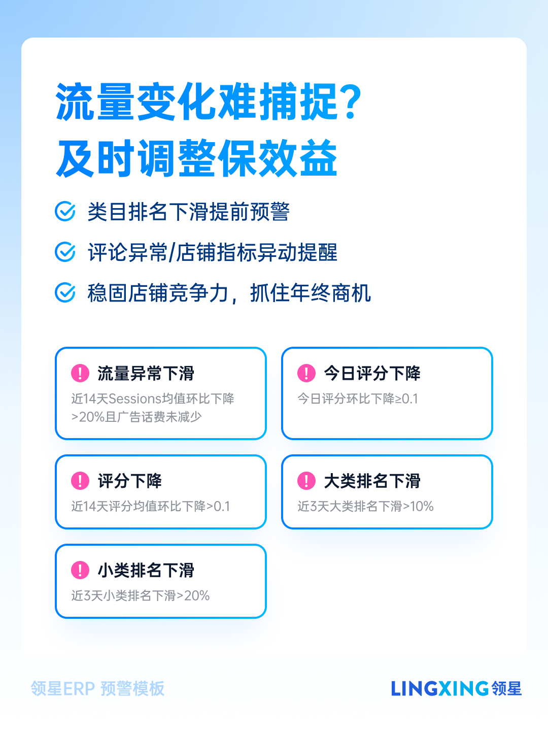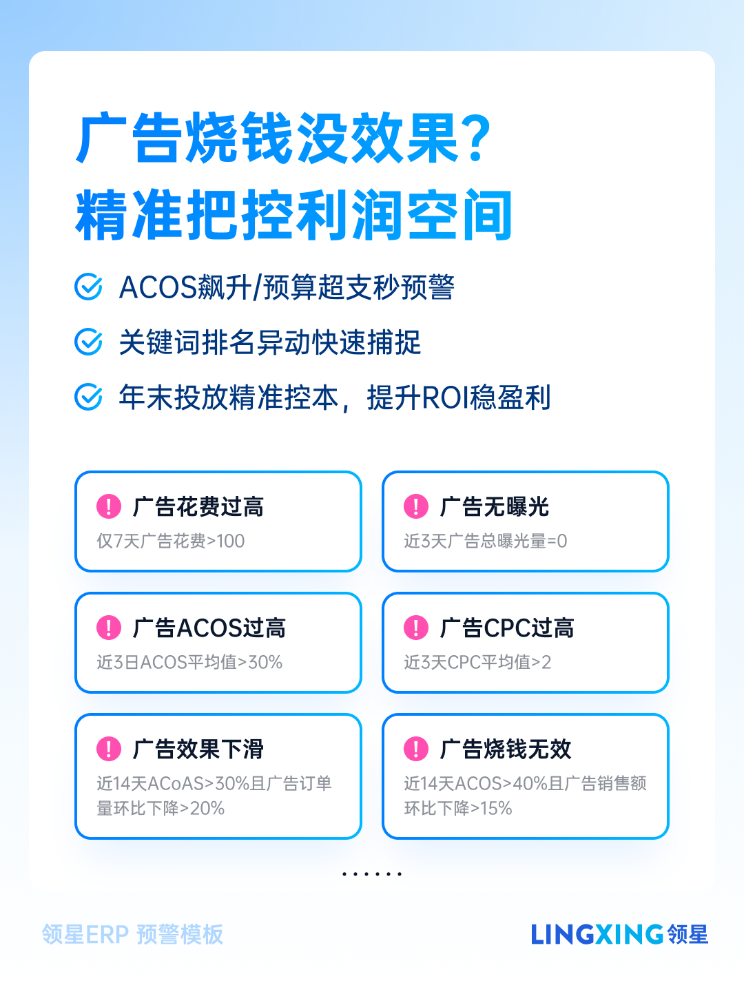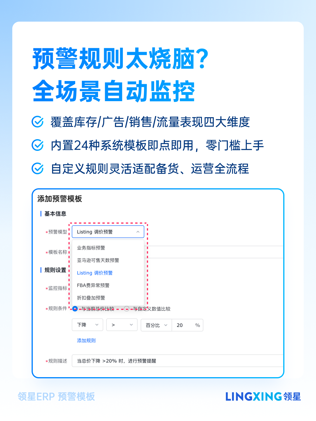 而领星 ERP 的【预警模板】功能,正是解决这些痛点的落地路径。告别繁琐的自定义设置,一键搞定所有核心数据监控,让运营管理从被动补救变成主动防控,把风险扼杀在摇篮里。