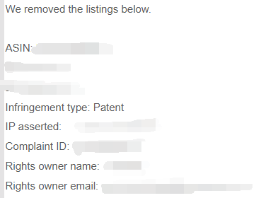 是收到一封邮件邮件里面说我们因为专利侵权了,产品被下架,有专利号,有权利所有者的名称以及邮箱号