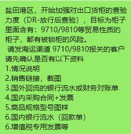 盐田港区,开始加强对出口货柜的查验力度(DR-放行后查验),目标为柜子里面含有:9710/9810等贸易性质的柜子,都有被锁柜的风险。