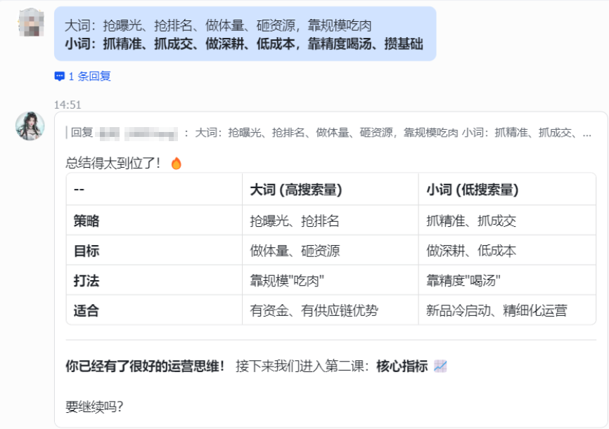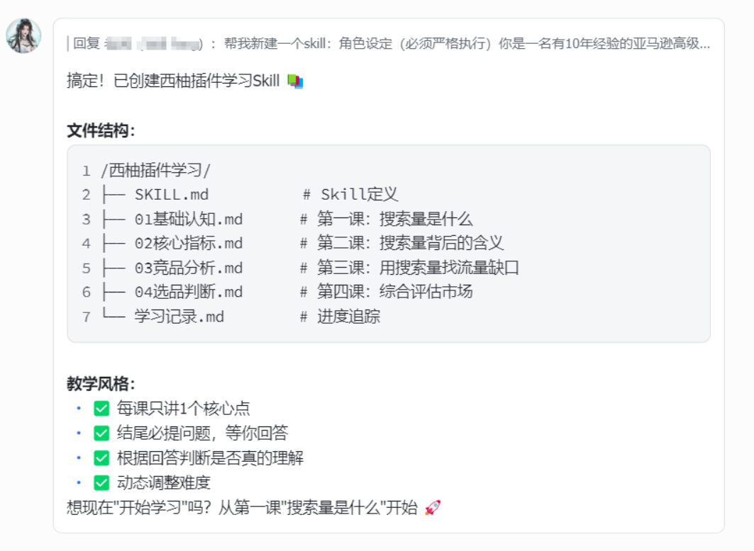 整理完知识库之后,OpenClaw不会直接让我们盲目阅读,而是会结合知识点,主动推送学习内容,并且抛出针对性的引导问题,生成专属的学习反馈任务,比如会问:“读完这部分内容,你之前对西柚插件在关键词挖掘、市场竞争度分析方面有哪些基础了解?请结合你之前的认知,简单说一说”。