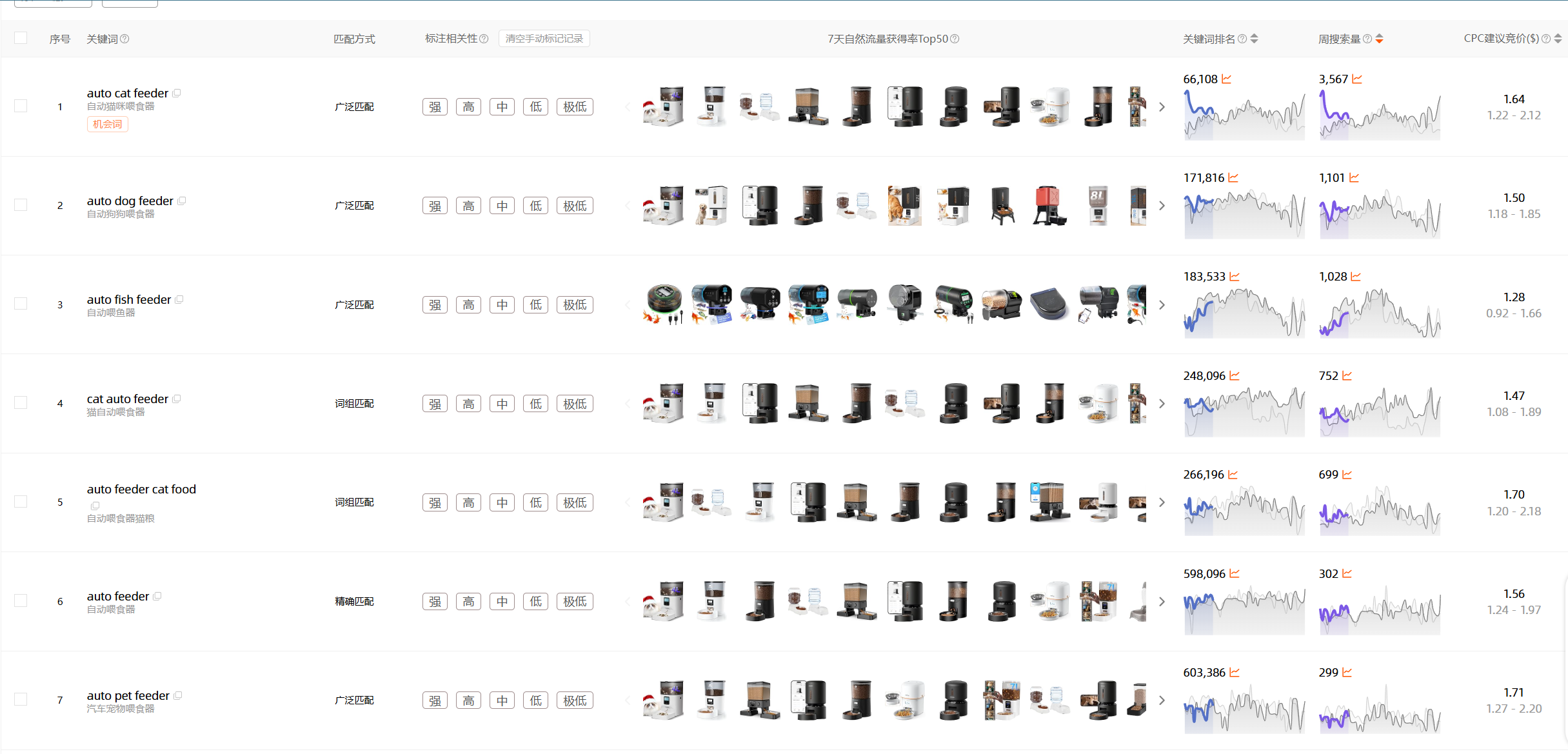 我也不知道有哪些关键词,那么我输入Auto feeder,发现给我们提供了不少词,然后我们搜索结果按照周搜索量倒序,可以得出部分关键词