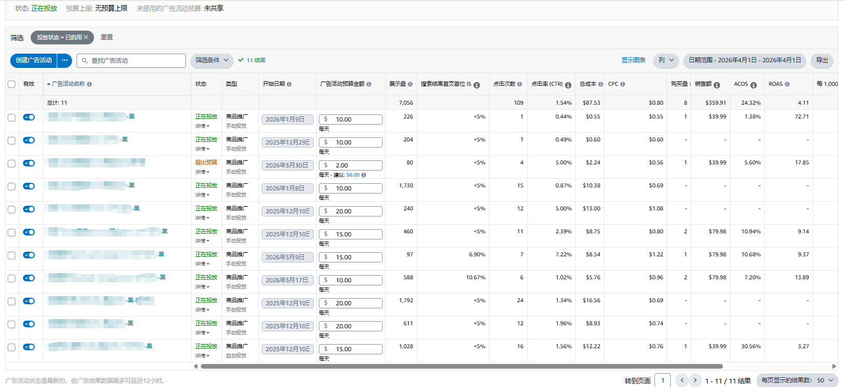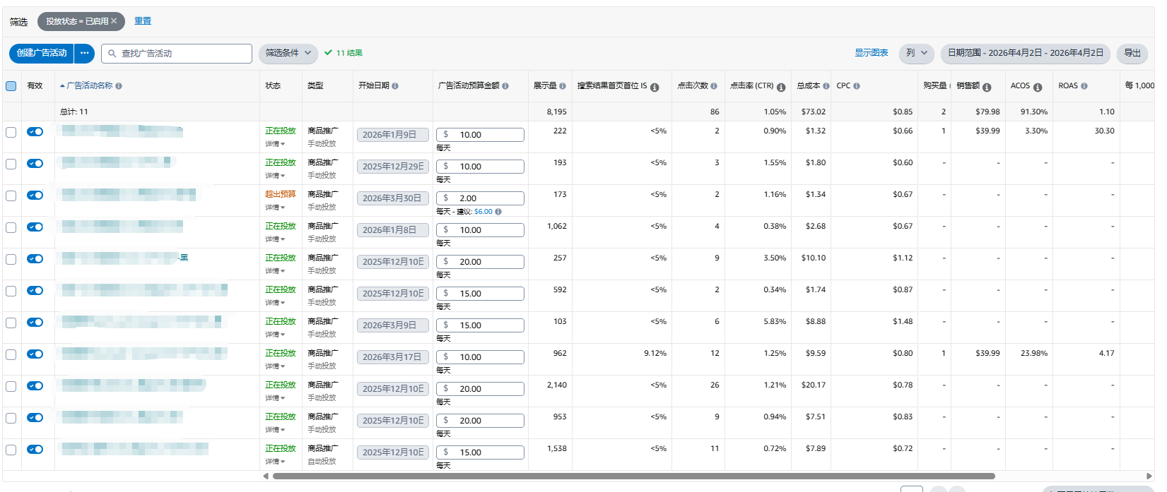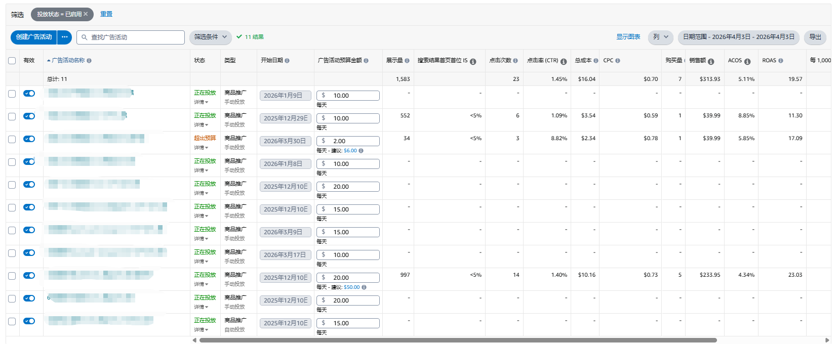 如图所示,连续三天的广告数据。1号2号正常有曝光点击,3号开始0曝光,都是投放的其中一个黑色变体没有曝光。看了绩效、lisiting页面都没有问题,问了客服也说一切正常,到底是什么原因?