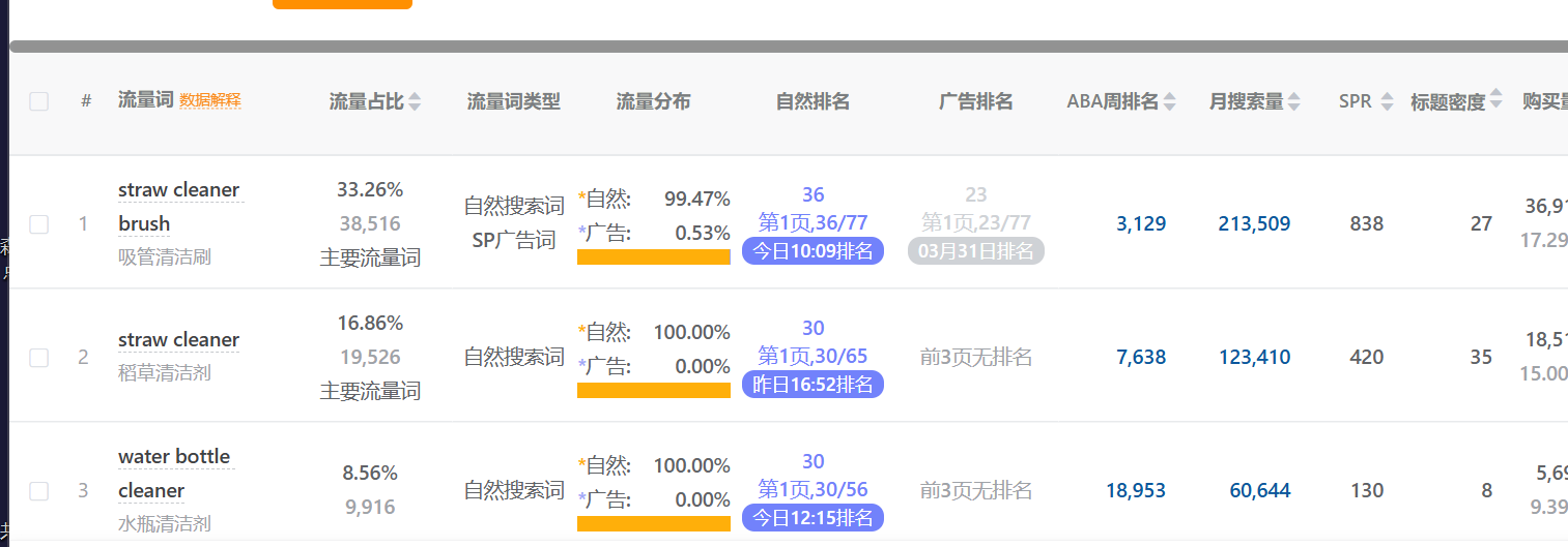 自然搜索词跟广告词,这个你看他的自然流量很多,广告词就14,说明人家把握了许多自然流量,不是靠广告硬推。如果广告流量词比自然流量词多,利润又低的情况下,可能遇到利润都让广告烧完的情况。