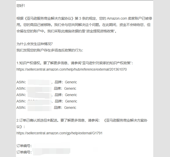 Generic上架会被侵权关店?美国账号收到停用邮件,显示原因为知识产权侵权+订单确认派送但未配送,有无遇到过的,店铺是否还有救回的可能?