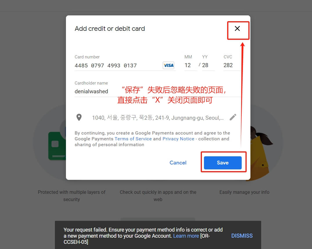 因为使用的是虚拟信用卡信息,会有错误提示,看到提示后点击“关闭按钮”即可。