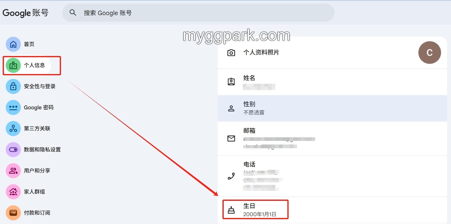 打开:Google 账号 → 个人信息 → 生日信息:确保大于18岁