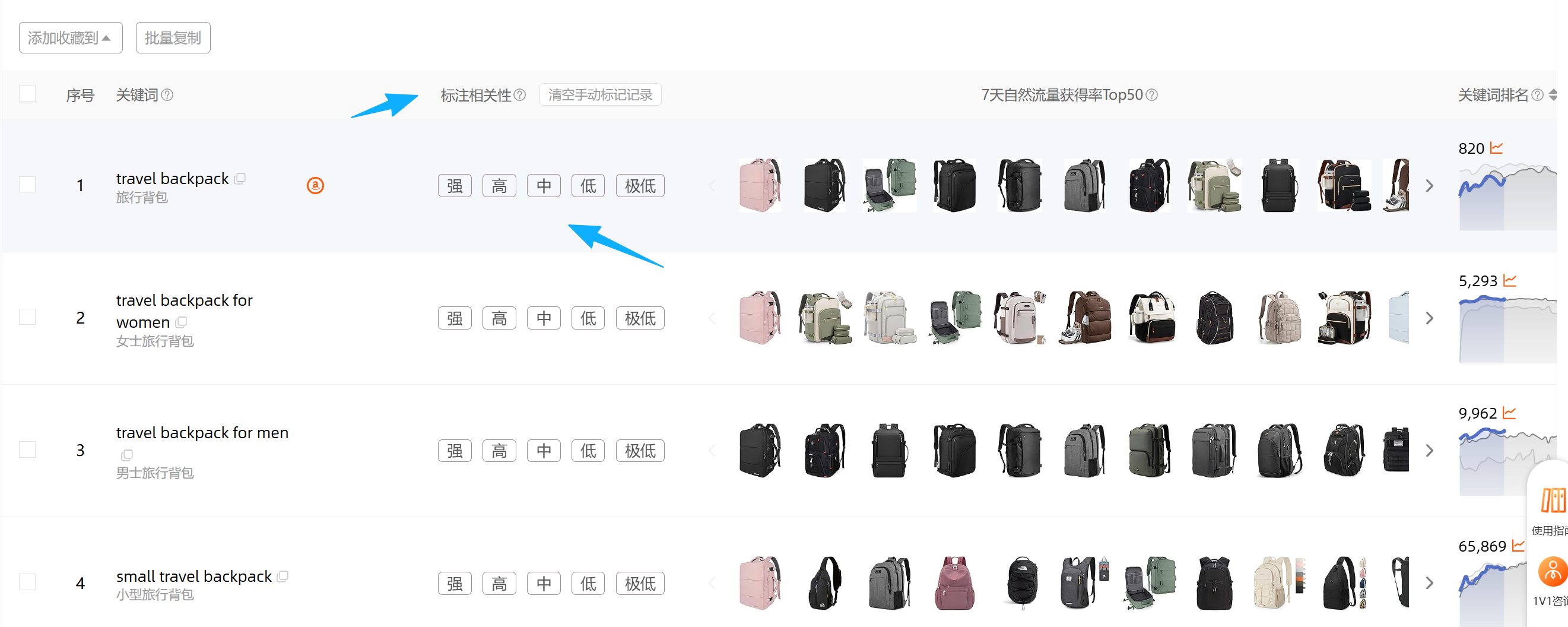 ②效率更快的就是借助工具:西*找词找词多Asin对比功能,它会自动评估关键词与一批ASIN之间的相关性,然后你可以把表格下载下来然后用Vlookup函数按照关键词将相关性这一列的数据引用导到你自己已经搭建好的词库表中。另:以词找词的功能中也可以按照词根,并输入几个竞品Asin,然后在关键词列表中:看在7天自然流量获得率Top50ASIN的主图对自动标注的相关性进行手动的校验修改。