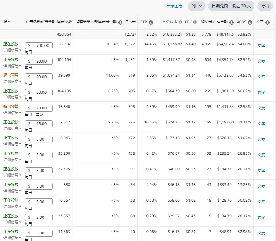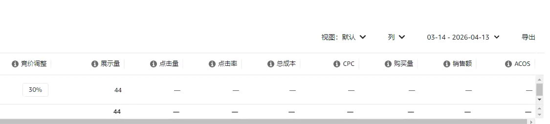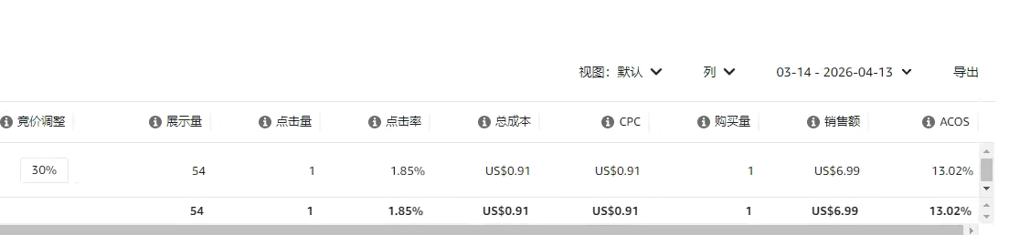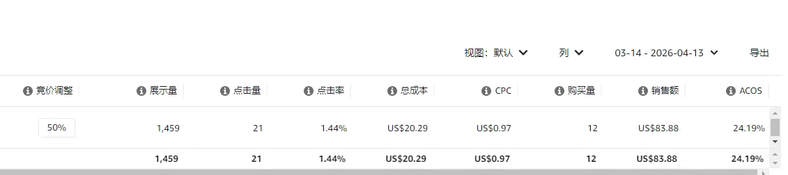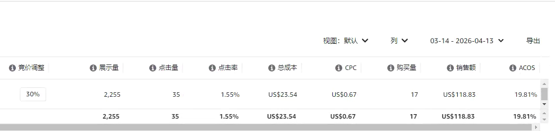 再看最后一个广告,一共出了17单,转化率是48.5%。虽然比产品整体的转化率稍微低了一点,但它的ACOS表现其实还不错。因此,我选择给它增加20%的竞价百分比,让它继续去跑更多的数据,看看能不能帮我们拿到更多的订单。