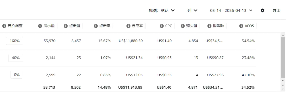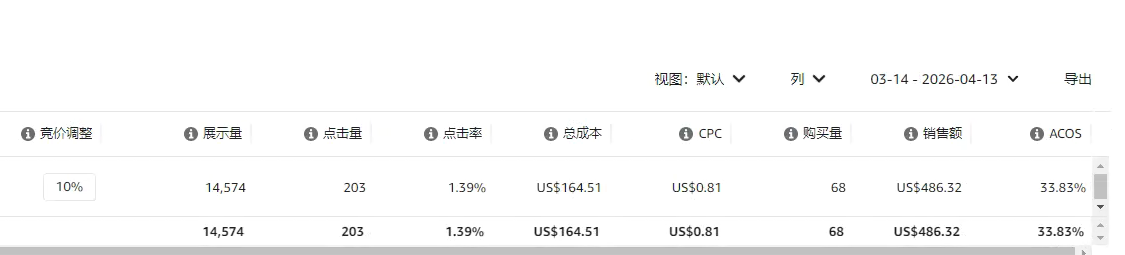 我们继续看第二个广告。这个组出单量比上一个多,但是它的转化率只有33.4%,比整体要低,ACOS也跑到了33.83%。这种情况下,如果能把CPC降低一点,进而降低ACOS,那这个广告还是有潜力的。所以这里10%的竞价比例,我先选择按兵不动,让它再跑一下看看。如果后续表现变得比较差,我就会直接把这个百分比给去掉。