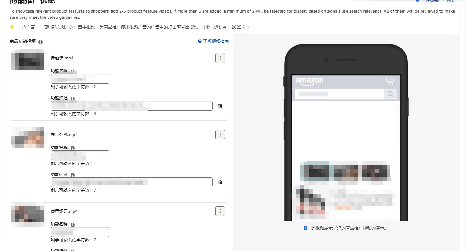 就在你的广告组里面,顶部会有一个“视频”的选项,直接点击这个位置。接着你会进入一个上传界面。在左边,你一共可以上传3~5个视频,并填好你的视频标题和视频描述。设置完成后,你的视频就会出现在右侧的广告位上,出现3~5个视频。买家在浏览时就可以直接通过看你的视频进行点击。