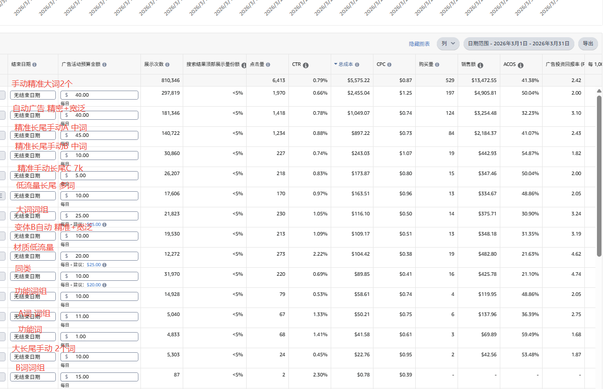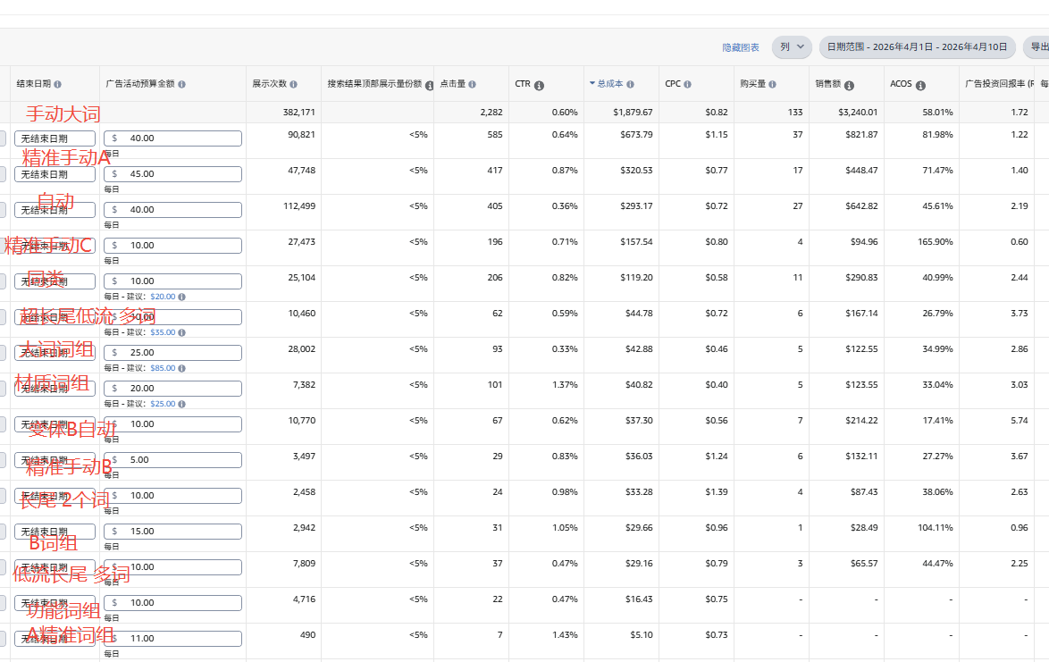 每单广告花费超标了。这里手动大词都是打顶部和搜索页面,100%BID;手动广告也都是瞄准搜索页面和顶部位置。开始时是和3月一样的打法,主打搜索页面和顶部位置,但缺乏优惠券,转化率差多了。