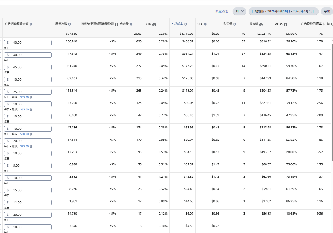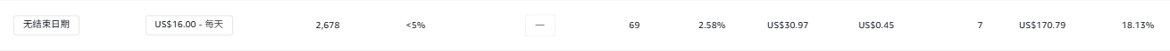 秒杀期间,价格是17.02。第一个是自动广告,第二个是手动大词。由于转化率很低,只花钱不出单,所以预算下调了。ACOS太高,接受不了了。所有广告都是“仅降低”。这个秒杀活动血亏,期间尝试把大词打到第一页的中部位置,但是没什么单,花费太高。