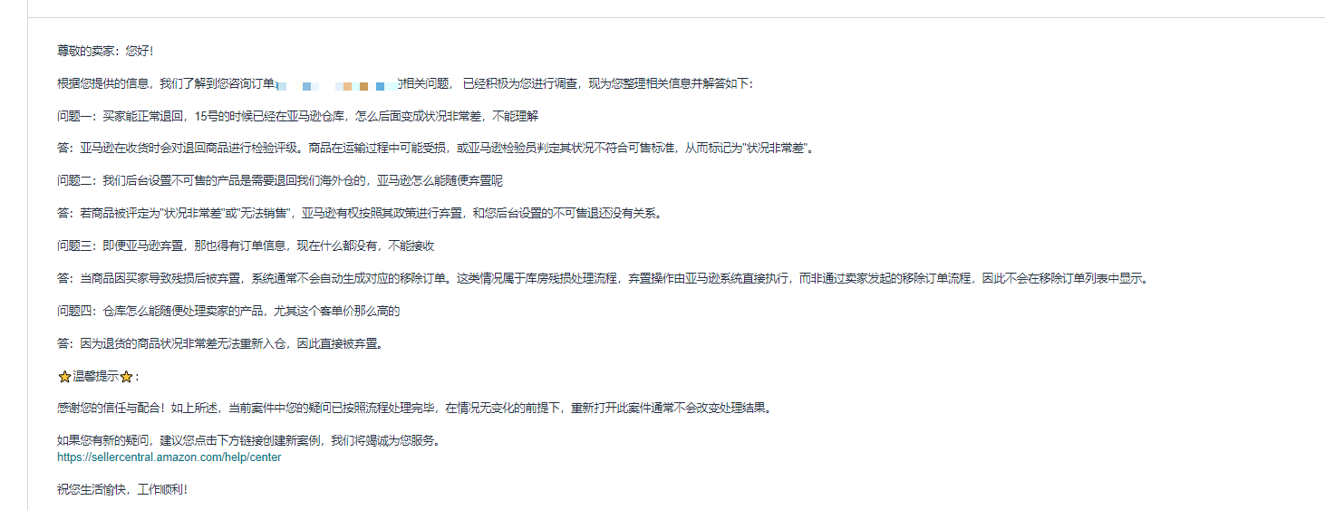 亚马逊回复:经调查,该退货产品“状况非常差,无法销售,且无法安全移除”,所以按照规定进行了弃置。他们坚持认为处置没有问题,拒绝赔偿。