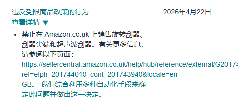 发货之前简单的上传了图片与关键词,没有触发任何违规,快到货时完善了图片与文案,不到一天就被亚马逊扫到,违反受限商品政策的行为,禁止在 Amazon.co.uk 上销售旋转刮器、刮器尖端和超声波刮器。