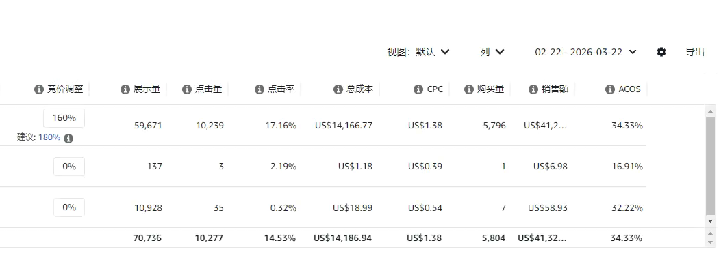 像这个案例里,顶部位置的数据就很明显,量大、点击高、出单也多,说明这个词真正能打的地方就是顶部。那你去给顶部加价,这个逻辑是成立的,因为钱确实花在能出单的位置上了。