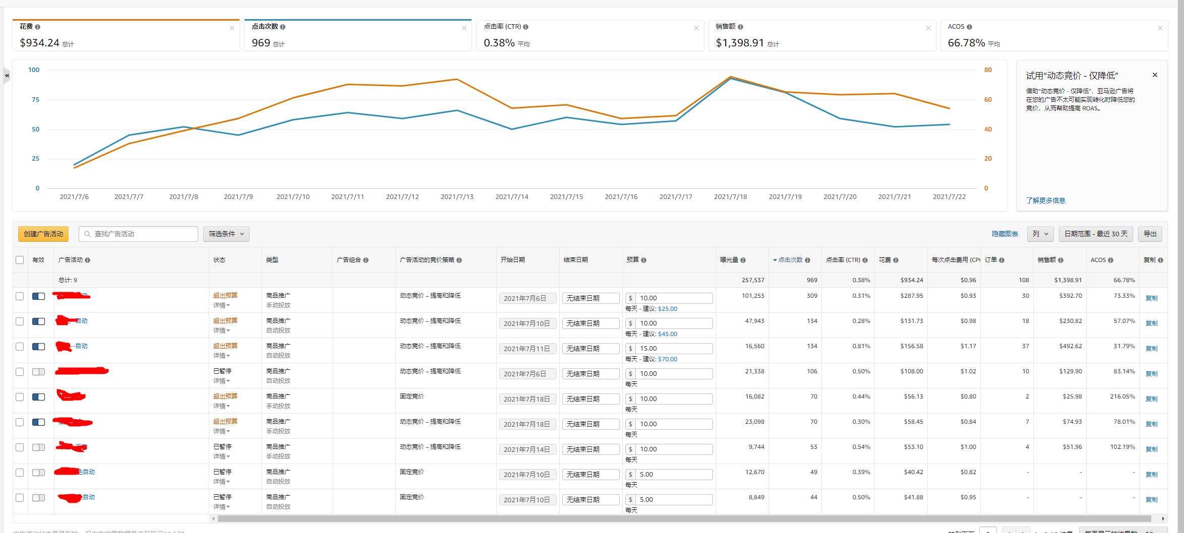 6.acos:总共2个产品6个sku,前期一周左右测试出有个sku还算ok,也就是acos保持30多那个,其他5个滞销,目前已经开始亏本拉流量清仓了,所以整体acos很高,如果要好看的数据,我把这几个滞销的停了就好了。问题是数据好看对我现阶段来说意义不大。