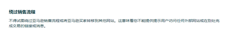 1、绕过销售流程:不得试图绕过亚马逊销售流程或将亚马逊买家转移到其他网站。这意味着您不能提供提示用户访问任何外部网站或在别处完成交易的链接或消息。
