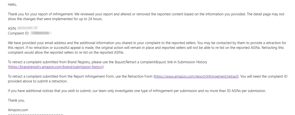 请亚马逊帮助停止侵权行为并阻止假冒产品到达客户手中,假冒产品不仅会对我们的销售造成巨大损失,还会损害客户的利益等等,可自己组织语言。