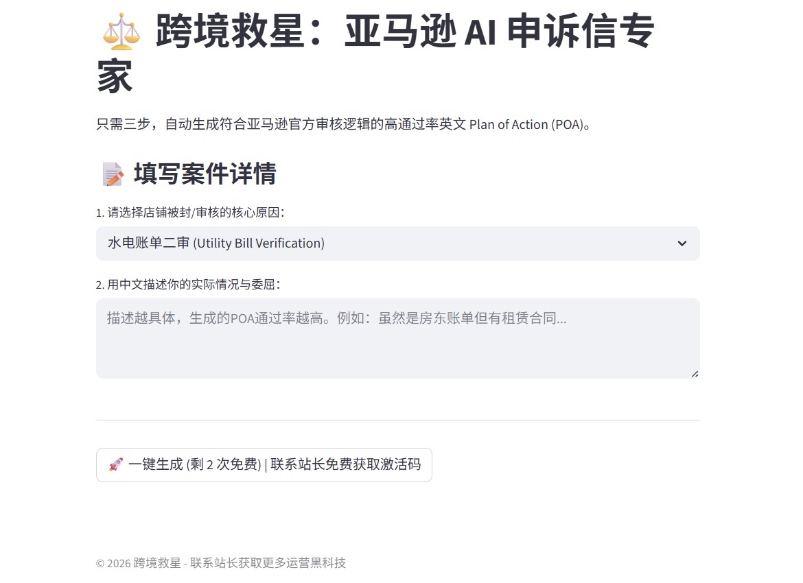 【为什么做这个工具?】 各位大佬好!我是个纯技术党。最近我身边做跨境的朋友被亚马逊二审和侵权搞得焦头烂额,找服务商代写一封POA动辄几千块,用的还是烂大街的模板,不仅贵还容易死号。